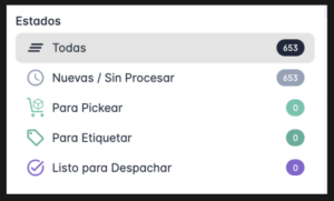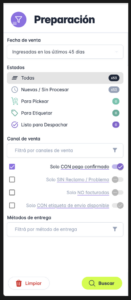 –Solo con preparación pendiente: Cuando está activado, muestra únicamente los pedidos que todavía no completaron el proceso de preparación, es decir, que aún no fueron etiquetados.